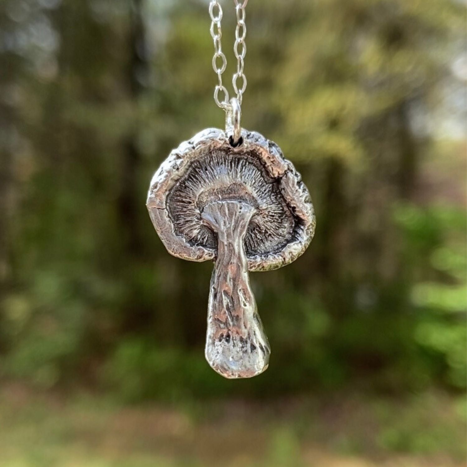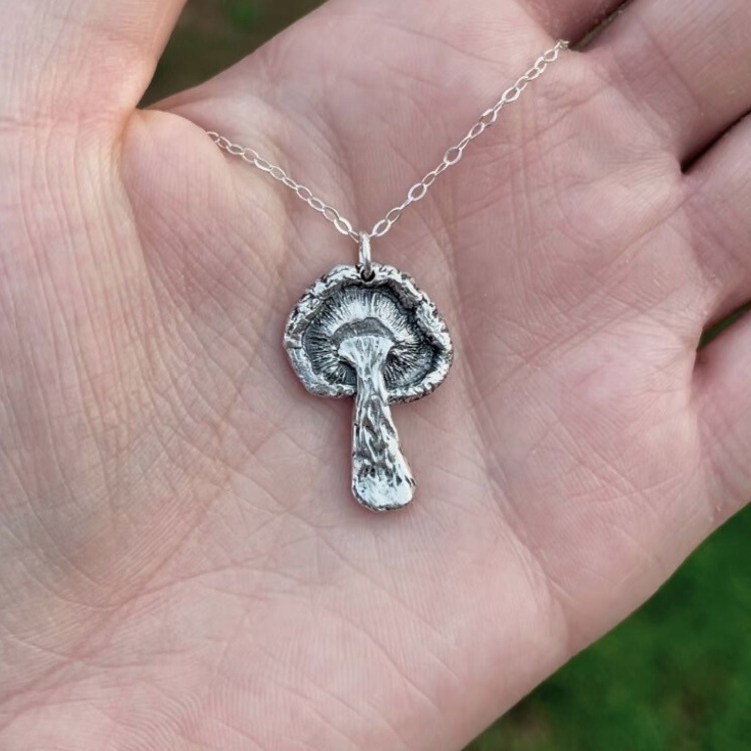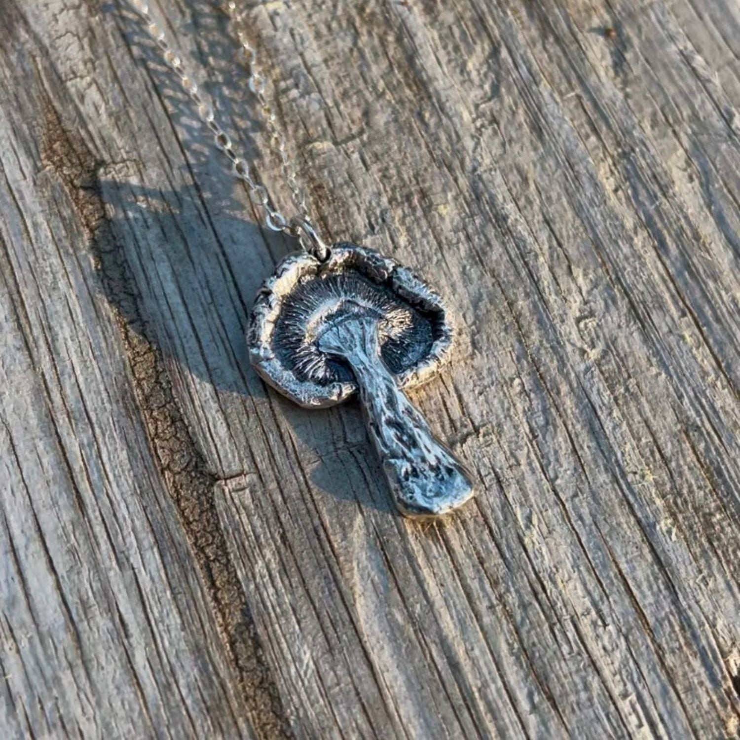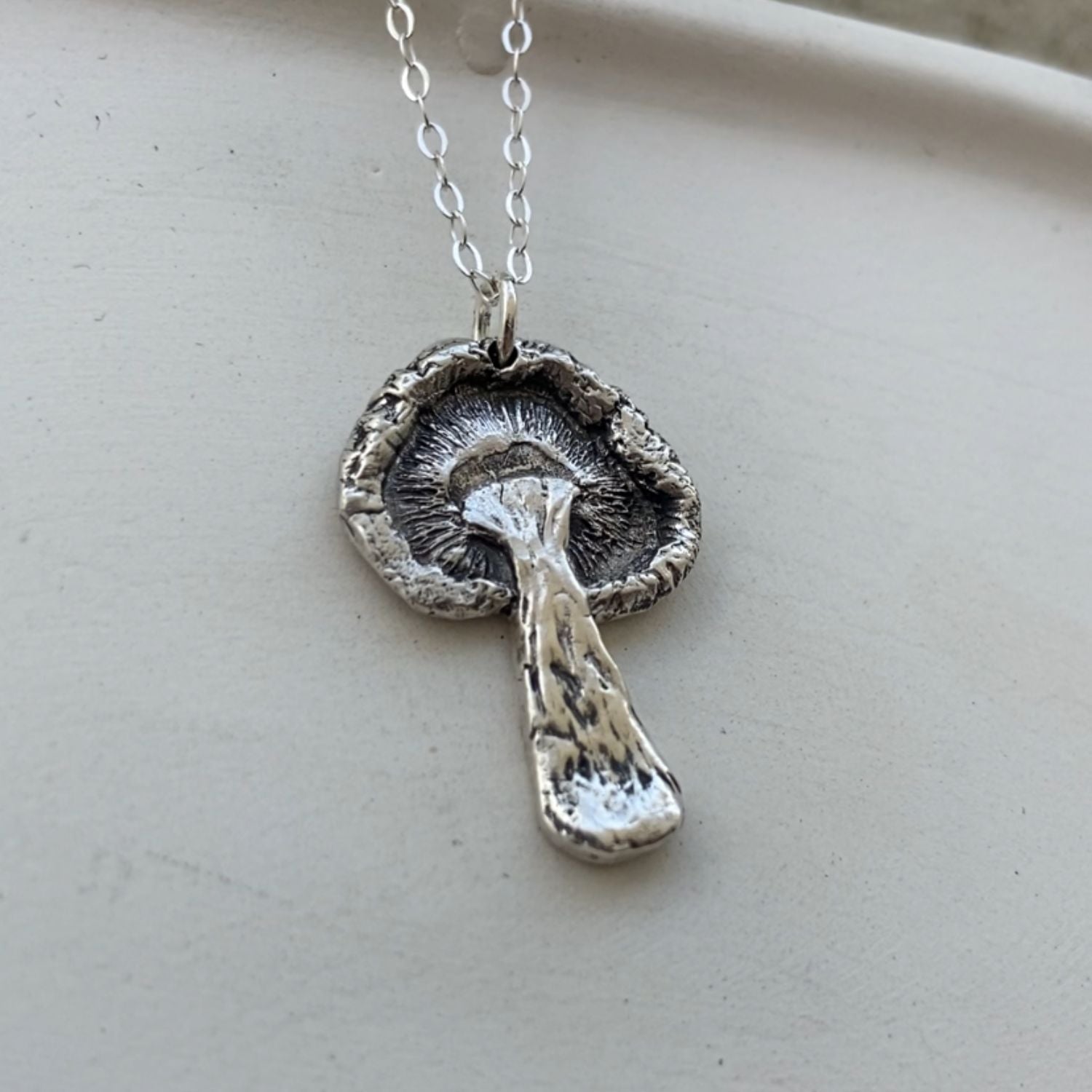 Handcrafted in fine silver, this shiitake mushroom necklace is inspired by the quiet wisdom and grounding energy of the forest, symbolizing nourishment, balance, and transformation. Wear it as a reminder to embrace life's subtle growth, finding strength in simplicity and the beauty of natureās cycles.