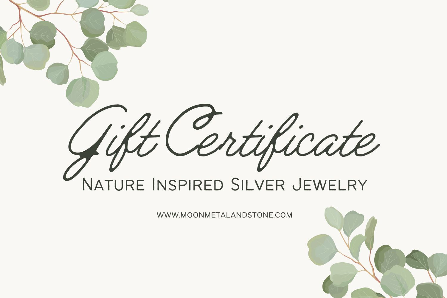 Our gift cards are a thoughtful way to share the beauty of handcrafted silver jewelry inspired by the natural world. Whether it's for a birthday, anniversary, or just because, you're giving more than jewelry—you're giving a story, an art piece, a moment of connection with nature.